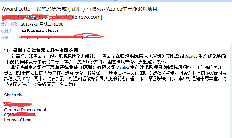 很高興告知貴公司,經過聯想集團采購組評定,貴公司在聯想系統集成(深圳)有限公司Azalea生產線采購項目-測試標段競標中最終中標,本項目按照報價文件,固定模塊單價,數量據實結算。