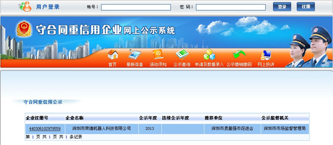 近日,廣東省工商行政管理局向社會公示了全省“守合同重信用”企業名單,深圳市榮德機器人科技有限公司喜獲上榜,首次榮獲該榮譽稱號。