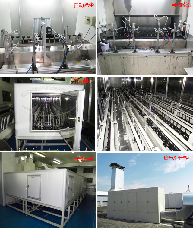 相機鏡頭固定噴槍式spindle噴涂流水線:噴漆裝工件治具—噴漆輸送線—噴漆前除塵—噴漆流平段—噴漆烘干線—噴漆廢氣處理柜